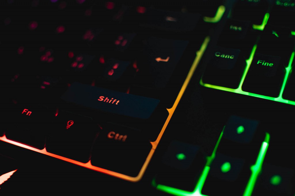 Laptop computer with row pink lighting and blank screen place on dark background. 3D illustration image.